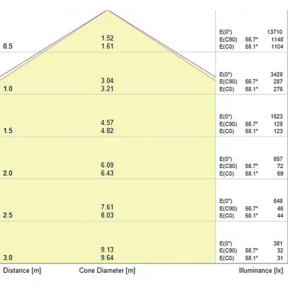 Der Abstrahlwinkel bezeichnet den Winkel, in dem das Licht aus der Lichtquelle ausgestrahlt wird. Er wird in Grad (D) angegeben. Je geringer die Gradzahl des Abstrahlwinkels ist, desto kleiner ist auch der Durchmesser des Lichtkegels, den die Lichtquelle produziert. Beispiel: Wird eine Lampe mit einem Abstrahlwinkel von 60 Grad an der Decke (2,5 m Höhe) angebracht, erzeugt sie einen Lichtkegel von 2,9 Metern Durchmesser. Hat die Lampe hingegen einen Abstrahlwinkel von 120 Grad, beträgt der Lichtkegel 8,7 Meter im Durchmesser. |