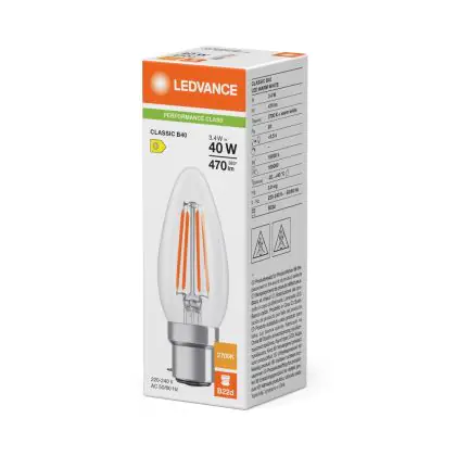 Ledvance Classic LED B22 Kerze Fadenlampe Klar 3.4W 470lm - 827 Extra Warmweiß | Ersatz Für 40W