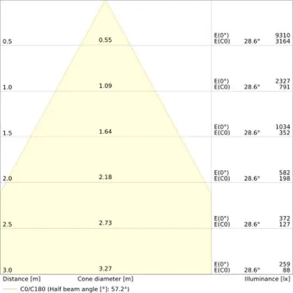 Der Abstrahlwinkel bezeichnet den Winkel, in dem das Licht aus der Lichtquelle ausgestrahlt wird. Er wird in Grad (D) angegeben. Je geringer die Gradzahl des Abstrahlwinkels ist, desto kleiner ist auch der Durchmesser des Lichtkegels, den die Lichtquelle produziert. Beispiel: Wird eine Lampe mit einem Abstrahlwinkel von 60 Grad an der Decke (2,5 m Höhe) angebracht, erzeugt sie einen Lichtkegel von 2,9 Metern Durchmesser. Hat die Lampe hingegen einen Abstrahlwinkel von 120 Grad, beträgt der Lichtkegel 8,7 Meter im Durchmesser. |