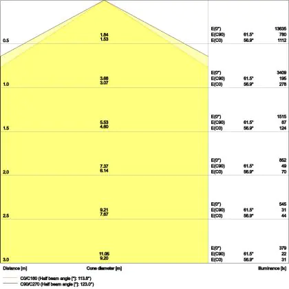 Der Abstrahlwinkel bezeichnet den Winkel, in dem das Licht aus der Lichtquelle ausgestrahlt wird. Er wird in Grad (D) angegeben. Je geringer die Gradzahl des Abstrahlwinkels ist, desto kleiner ist auch der Durchmesser des Lichtkegels, den die Lichtquelle produziert. Beispiel: Wird eine Lampe mit einem Abstrahlwinkel von 60 Grad an der Decke (2,5 m Höhe) angebracht, erzeugt sie einen Lichtkegel von 2,9 Metern Durchmesser. Hat die Lampe hingegen einen Abstrahlwinkel von 120 Grad, beträgt der Lichtkegel 8,7 Meter im Durchmesser. |