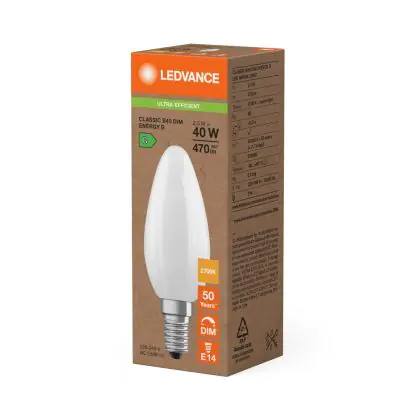 Cette ampoule Ledvance Classic LED E14 Bougie Dépolie 2.5W 470lm - 827 Blanc Très Chaud | Dimmable - Remplacement 40W avec son efficacité lumineuse de lumen par watt vous permettra de profiter d’un éclairage de qualité. Avec sa durée de vie de 50000 heures, vous n’aurez pas à vous soucier de son remplacement avant quelques années.