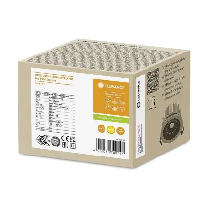 Lot 10x Ledvance LED SPOT FIRE RATED Aluminium 8W 680lm 36D - 930 Blanc Chaud | Diamètre 68mm - IP65 - Meilleur Rendu De Couleur - Dimmable est un spot LED encastrable. Ce luminaire est conçu pour un éclairage d’accentuation pour un usage domestique ou bien professionnel. LED Intégré, ce spot LED Ledvance en Aluminium a besoin d’une place nécessaire de 68mm de largeur et mm de profondeur. Ce luminaire est compatible avec une ampoule GU10, il est important de faire attention si vous décidez de changer d’ampoule.